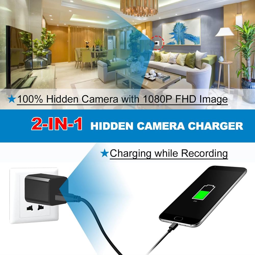 - 1080P Video Clarity USB Charger Camera record real 1080P HD video with a 70° wide angle of view and this camera looks like a small one phone charger adapter, no one can notice that it’s a camera.