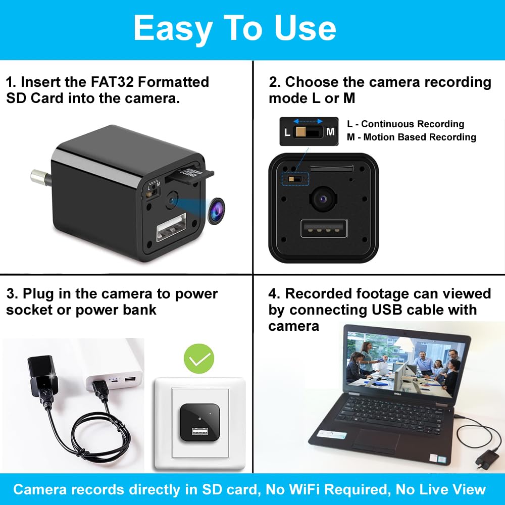 - Easy to use: The plug & play surveillance charger camera supports FAT32 format SD card and requires no prior setting. Just Insert FAT32 Formatted SD card into the camera and plug in the camera to power socket or power bank to start video recording. The video content recorded on the SD card can be viewed by connecting by USB cable (USB Cable included) into a PC/Laptop Or with OTG connector to Smartphone (OTG connector Not included).